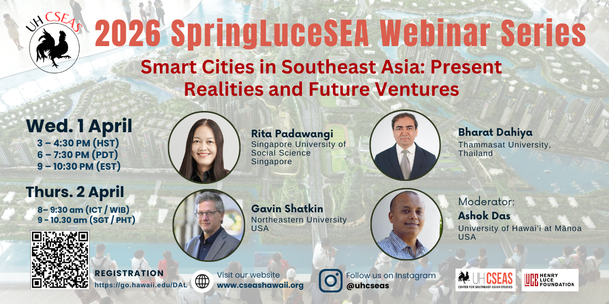 Wednesday, April 1, 2026, 3:00–4:30 PM (HST) | Registration: https://go.hawaii.edu/ZAD Join us for the second webinar of the 2026 Spring LuceSEA Webinar Series on Smart Cities in Southeast Asia: Present Realities and Future Ventures. This webinar explores Southeast Asia’s fast-evolving smart city initiatives – from data governance to climate adaptation. This session asks, “Are Southeast […]