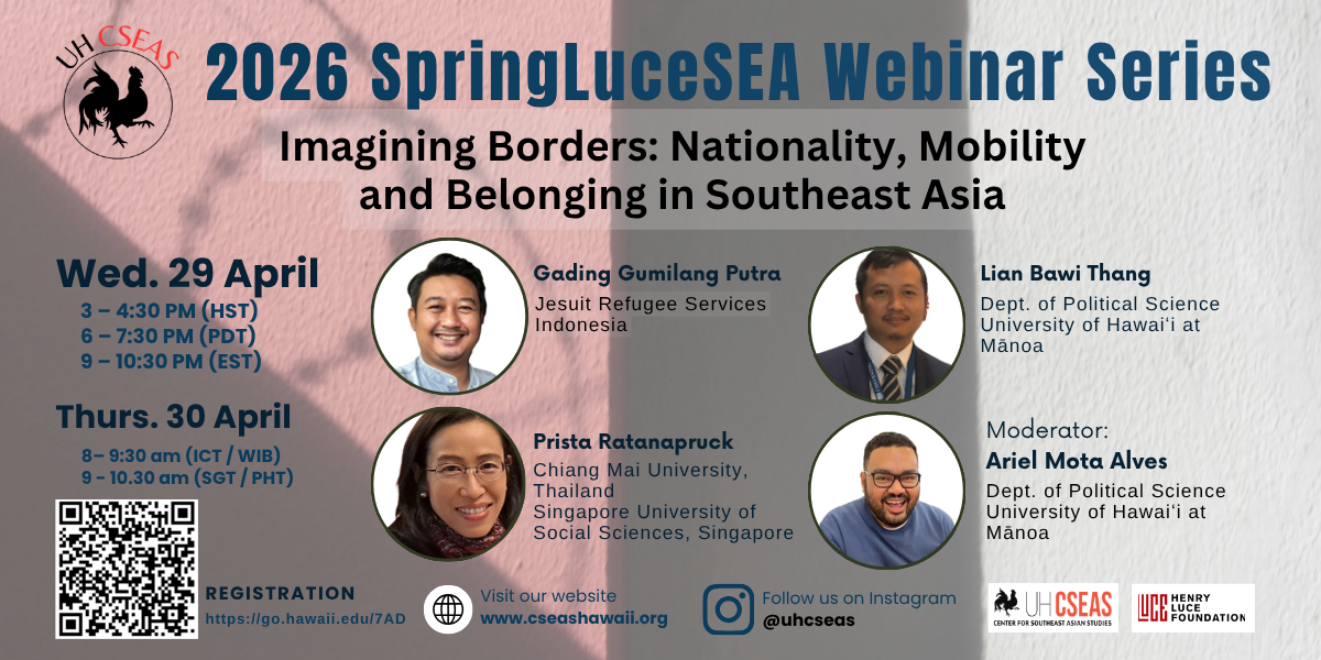 Wednesday, April 29, 2026, 3:00–4:30 PM (HST) | Registration: https://go.hawaii.edu/7AD Join us for the second webinar of the 2026 Spring LuceSEA Webinar Series on Imagining Borders: Nationality, Mobility and Belonging in Southeast Asia. The webinar discusses how Southeast Asian borderlands live, negotiate, and challenge national boundaries. From disputes to statelessness. By discussing Stateless populations, informal […]